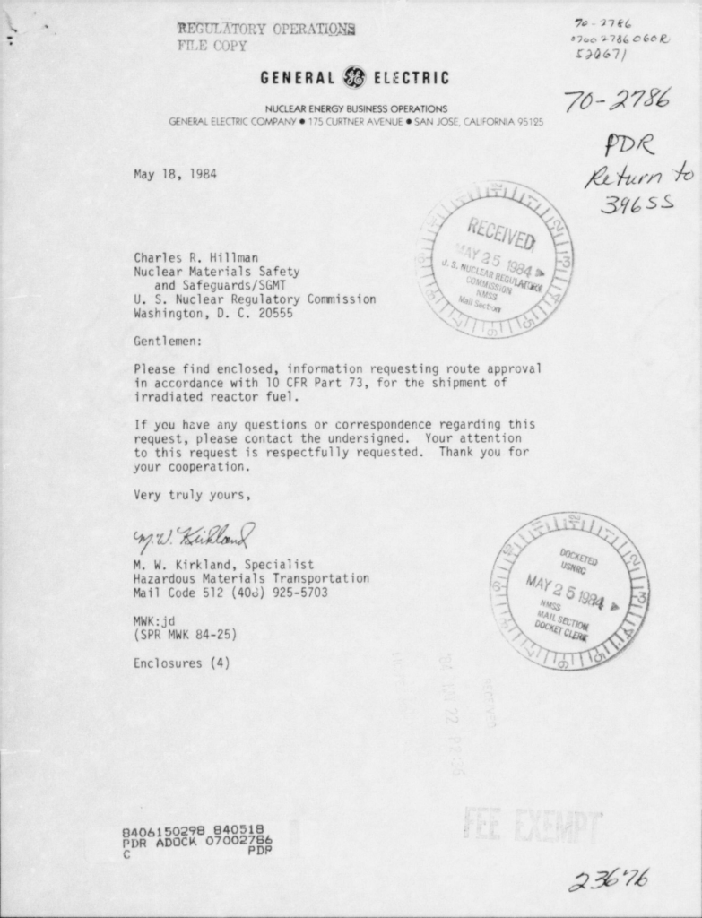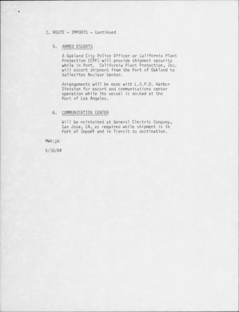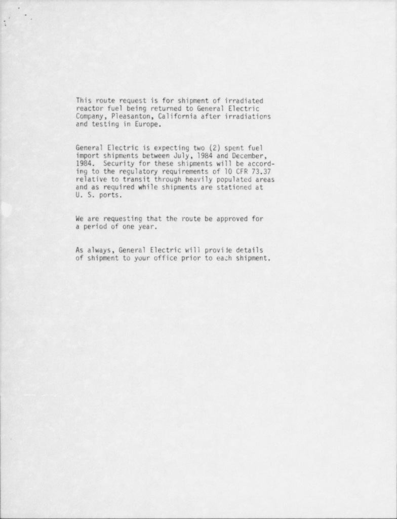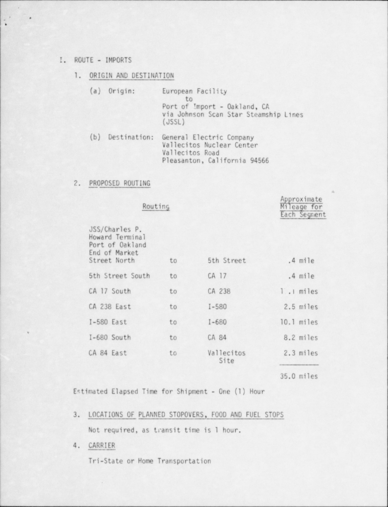 Nuclear Regulatory Commission has several surviving documents on General Electric moving Nuclear Reactor Fuel Rods to and from the Oakland Howard Terminal from its Vallecitos Nuclear Center near Pleasanton California where they were regularly shipping nuclear reactor fuel rods to Europe and back to be irradiated and tested. This is just one of the reports from May 18 1984:
