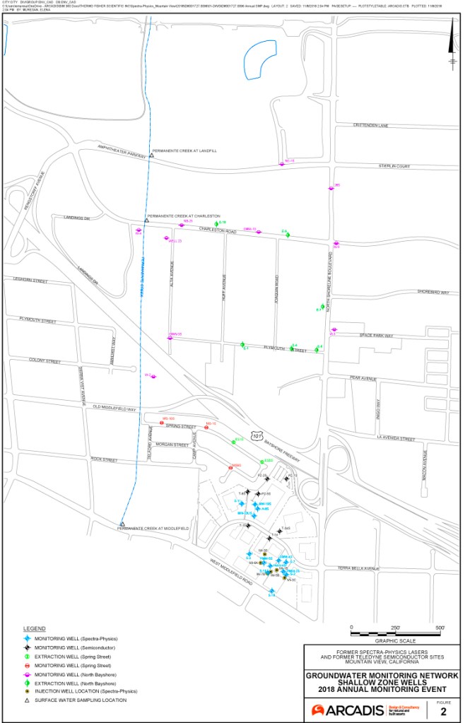 The responsible parties (RPs) for the Teledyne/Spectra-Physics site completed a Monitored Natural Attenuation (MNA) study in the off-property area north of and downgradient of the site. The MNA study concluded that natural breakdown of the chlorinated volatile organic compounds of concern is occuring naturally and at the same rate as groundwater extraction. As a result, only a few of the off-property downgradient extraction wells were operating mainly to maintain hydraulic control of the plume. The RPs completed a pilot study to test the feasibility of enhanced reductive dechlorination (ERD) and concluded that ERD is feasible with bioaugmentation of the Shallow Zone.