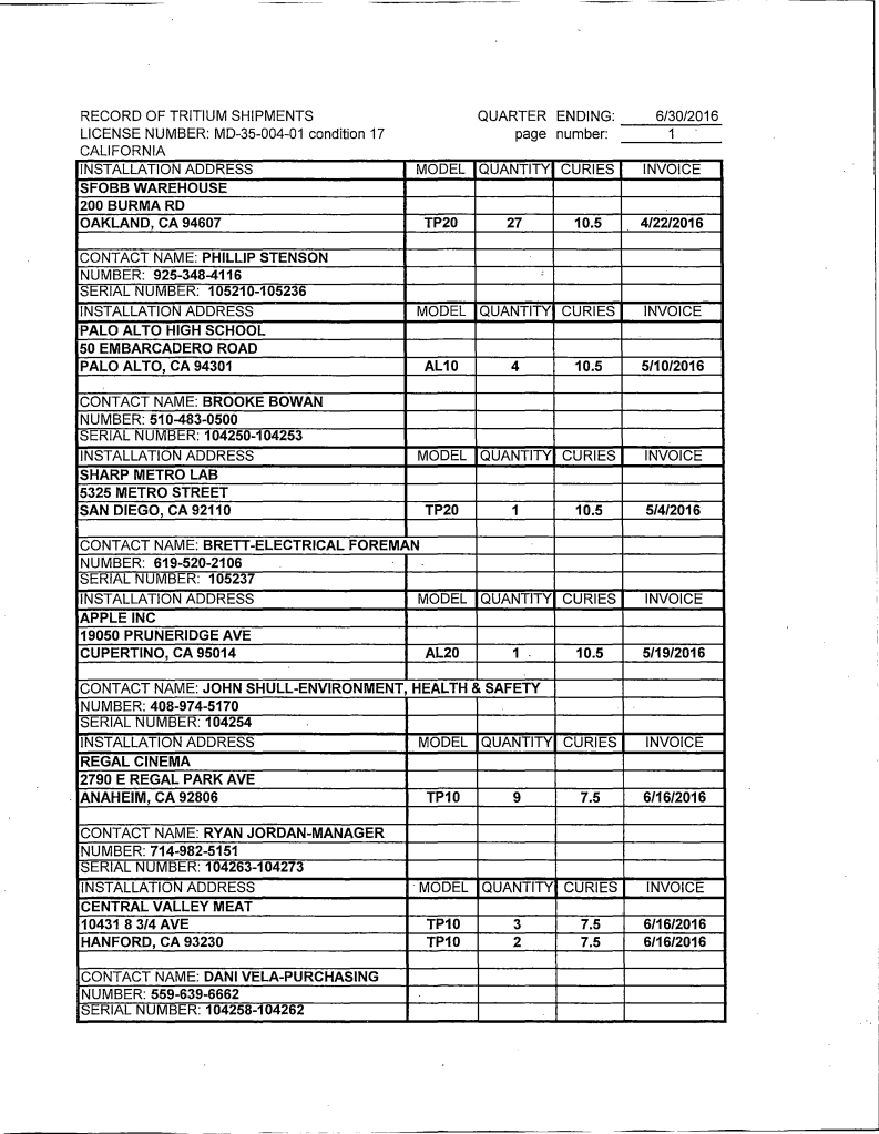 I was about to type up a report on Fairchild Semiconductors in Mountain View using Tritium as a light source for their LCD displays at what is now a Google Quad building on 434 Ellis Street, Mountain View when I came upon this report showing Tritium being delivered to Apple at 19050 Pruneridge Ave Cupertino. 10.5 curies of Tritium which is a radioactive isotope of hydrogen that has a half life of 12.32 Years. This is an invoice for 4-01-2016 to 6-30-2016 and the cover sheet for the invoice is below. Source is Document at Nuclear Regulatory Commission website