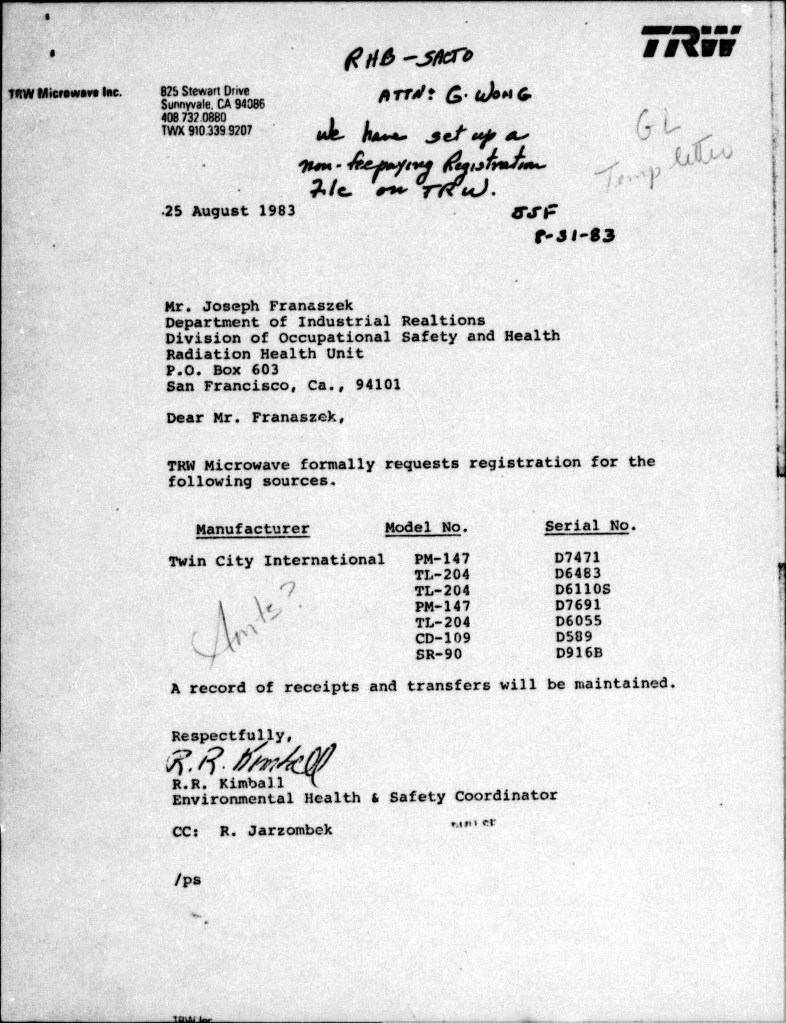 TRW Microwave was registered with the State of California’s Department of Health with a Radiological Materials License and here is a list of their isotopes they received :